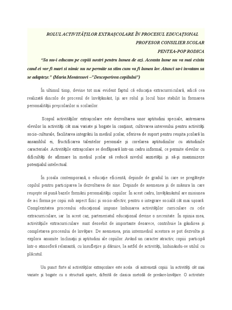 untuk "Importanta Activitatilor Extrascolare In Procesul De Formare A Copiilor"